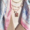 Collana modello rosario (si veda la sezione MISURE per i cm esatti) con graziosi micro cristalli di colore rosa tenue e maglia metallica in acciaio inossidabile ed anallergico dorato.