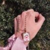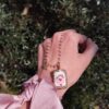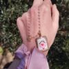 Collana modello rosario (si veda la sezione MISURE per la lunghezza esatta in cm) con delicati cristalli rosa petalo e maglia metallica in acciaio inossidabile ed anallergico dorato.
