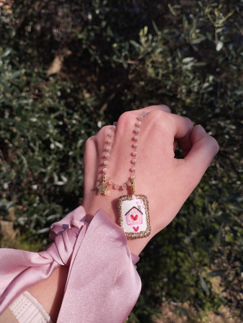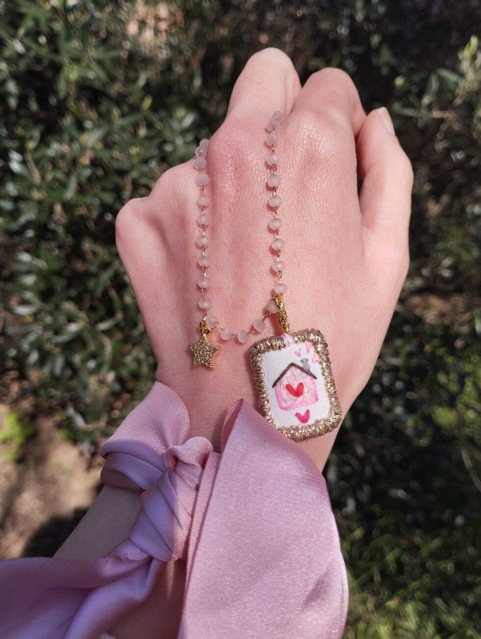 Medaglietta tessile centrale sagoma rettangolare ricamata a motivo casetta e cuoricini nei toni del rosa pastello con dettagli fucsia su base di cotone panna profilato lurex oro (misure circa 1,8 cm per 1,4 cm).