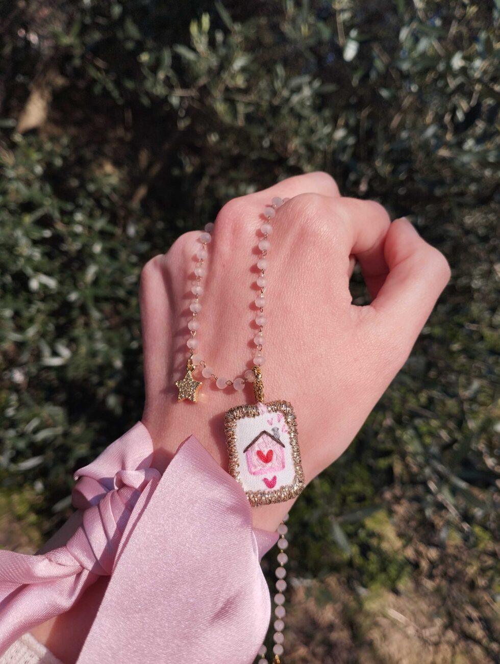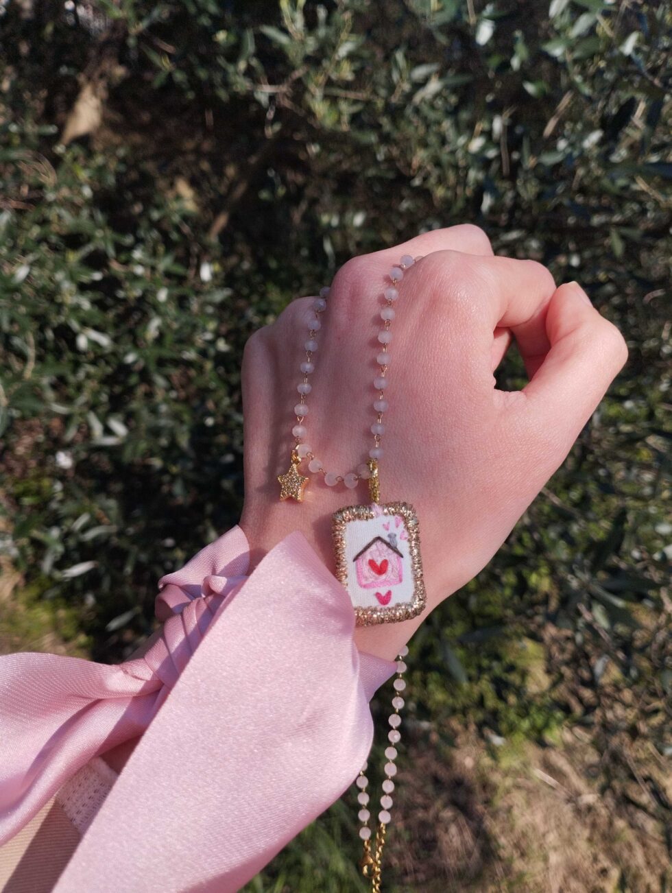 NB: nella prima e dalla quarta foto della galleria, per esigenze dimostrative ed estetiche rispetto alla sequenza fotografica dello shop, la presente collana è stata proposta in abbinamento al rosario “Fiocchetto” a base bianco panna ma si tratta di due collane distinte e vendute singolarmente e separatamente, NON di una collana a doppio giro e a doppio ciondolo tessile.