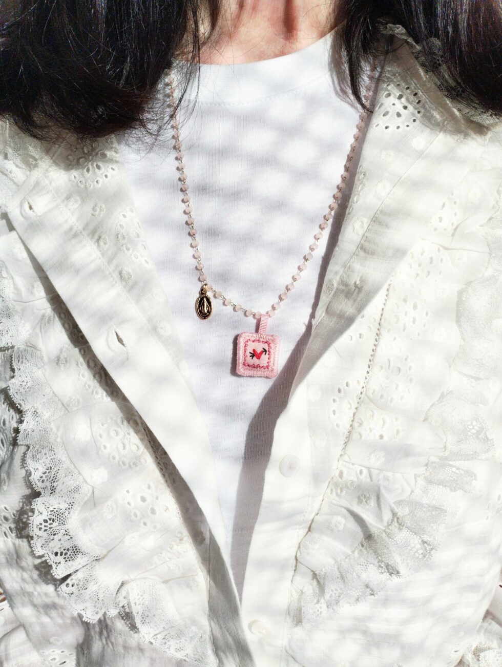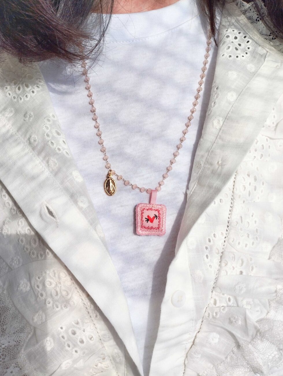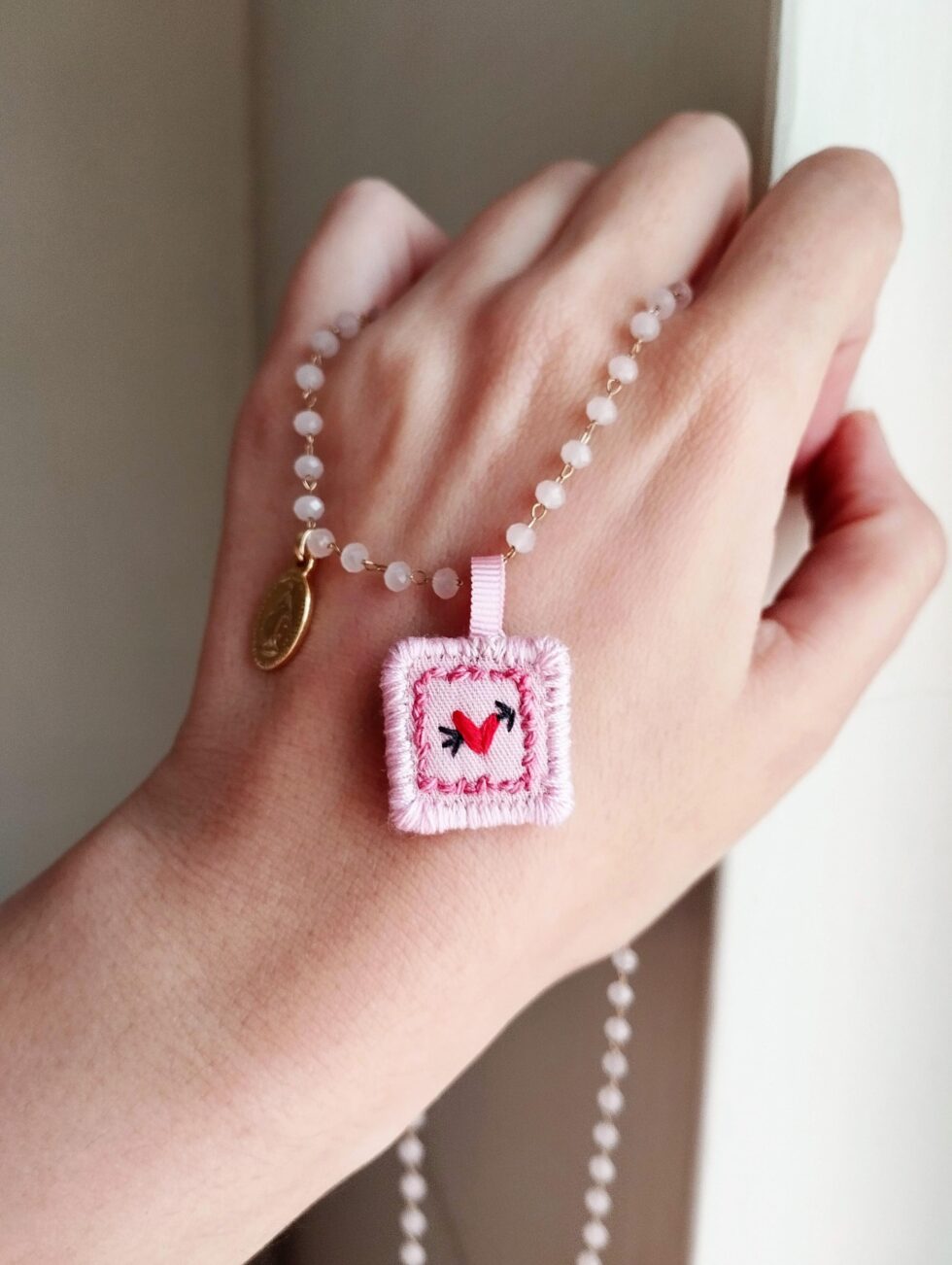 Medaglietta tessile centrale sagoma rettangolare ricamata a motivo cuore rosso con freccia e ricamo floreale sul perimetro su base di cotone rosa profilata nei delicati toni del rosa (misure circa 2 cm per 1,5 cm).