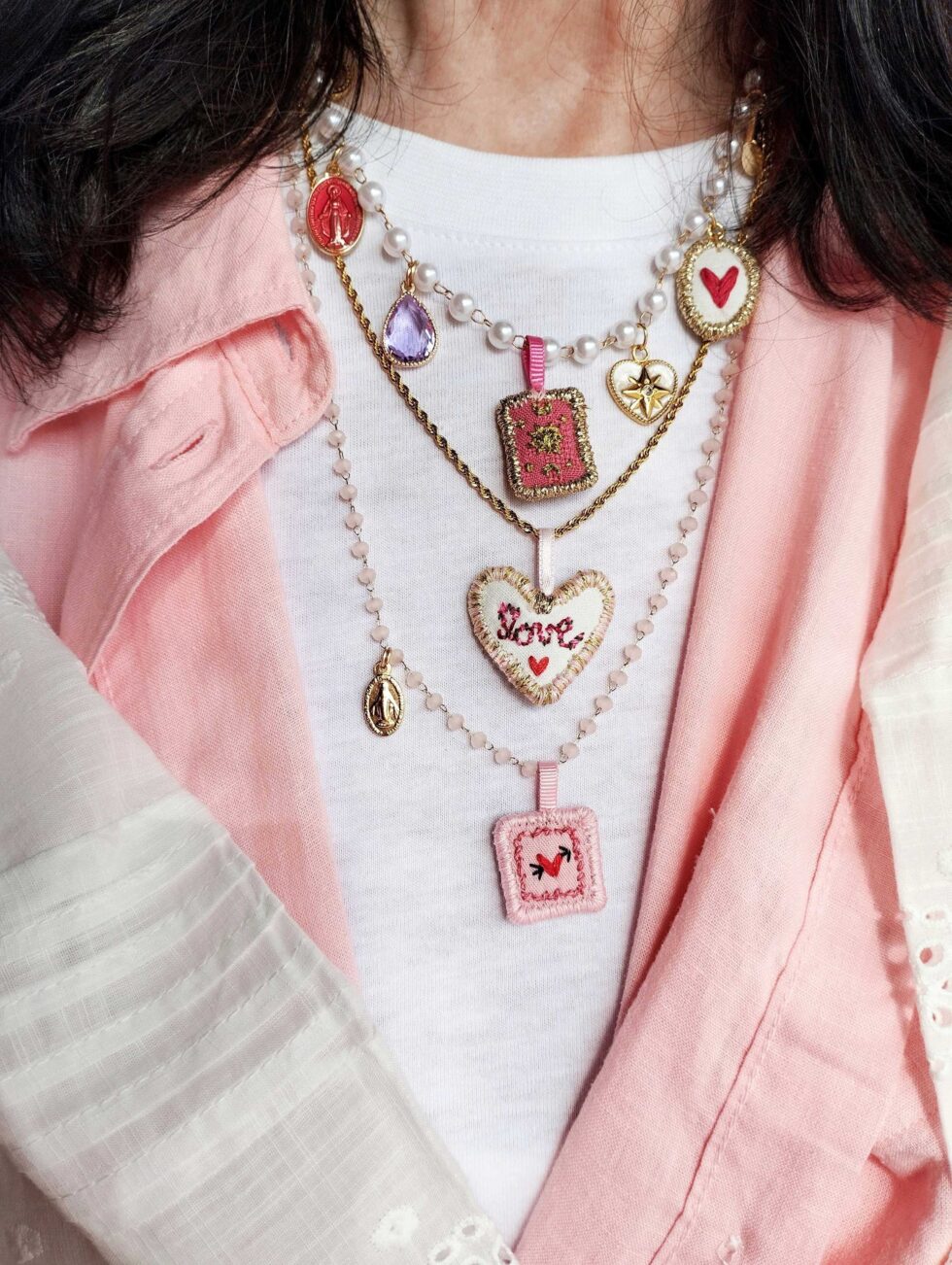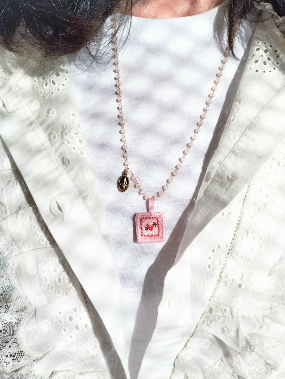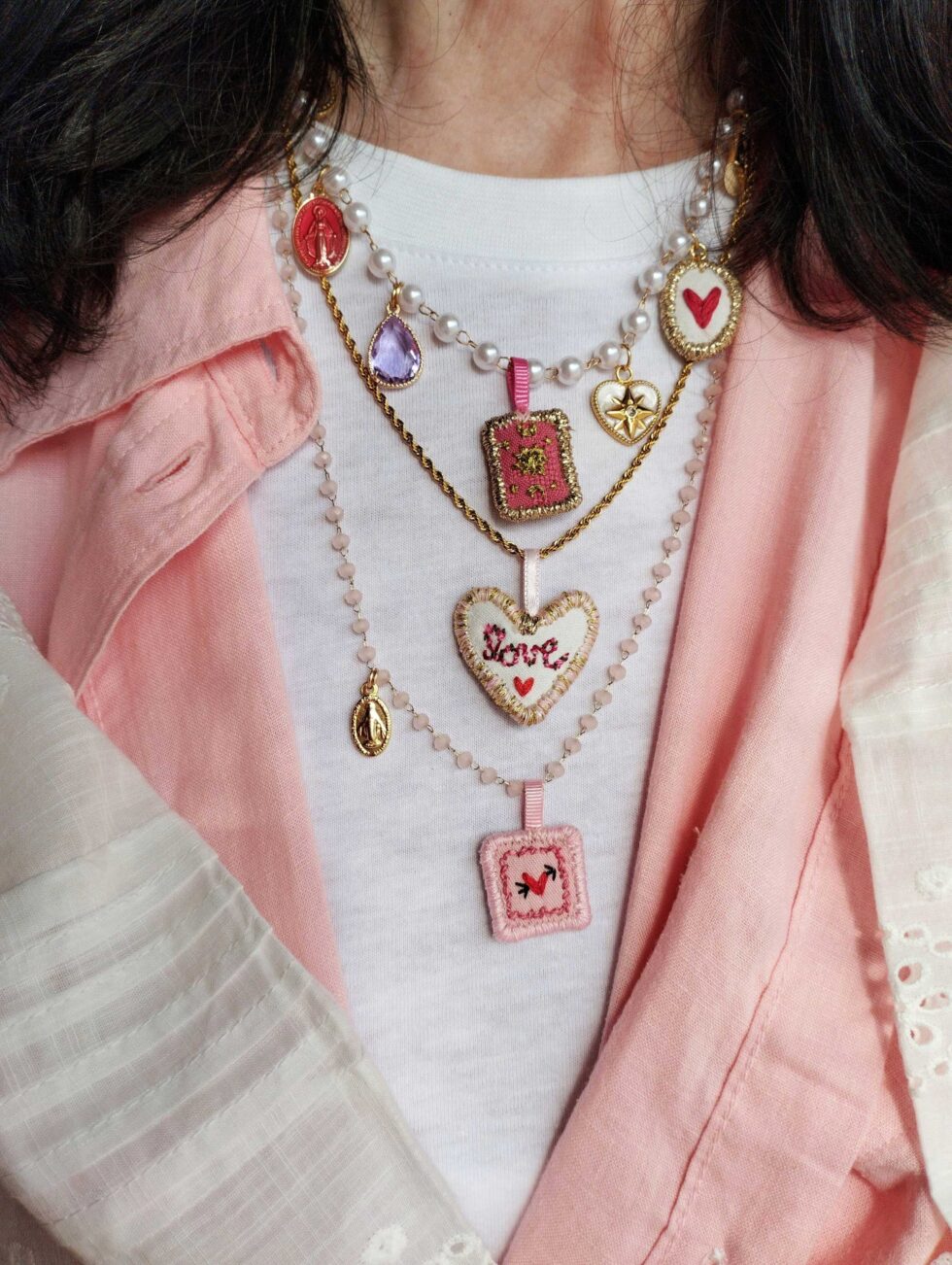 Medaglietta tessile centrale sagoma rettangolare ricamata a motivo cuore rosso con freccia e ricamo floreale sul perimetro su base di cotone rosa profilata nei delicati toni del rosa (misure circa 2 cm per 1,5 cm).