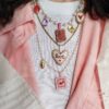 Collana modello rosario (MODELLO INTERMEDIO TRA GIROCOLLO E MEZZOBUSTO: si veda la sezione MISURE per la lunghezza esatta in cm) con graziosi cristalli color rosa pastello e maglia metallica in acciaio inossidabile ed anallergico dorato.