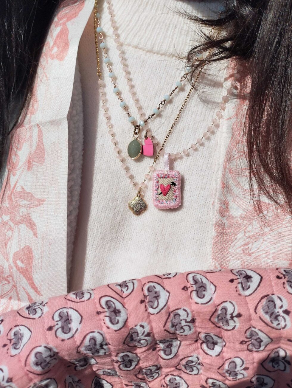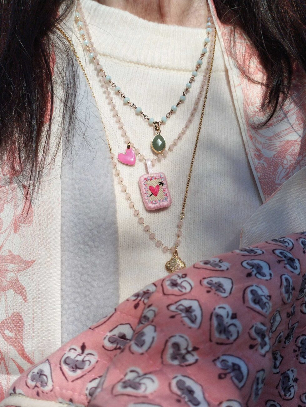 Medaglietta tessile centrale sagoma rettangolare stretta e allungata, ricamata a motivo cuore rosa fucsia con freccia e ricamo floreale sul perimetro su base di lino beige profilata nei delicati toni del rosa (misure circa 2 cm per 1,5 cm).