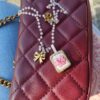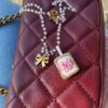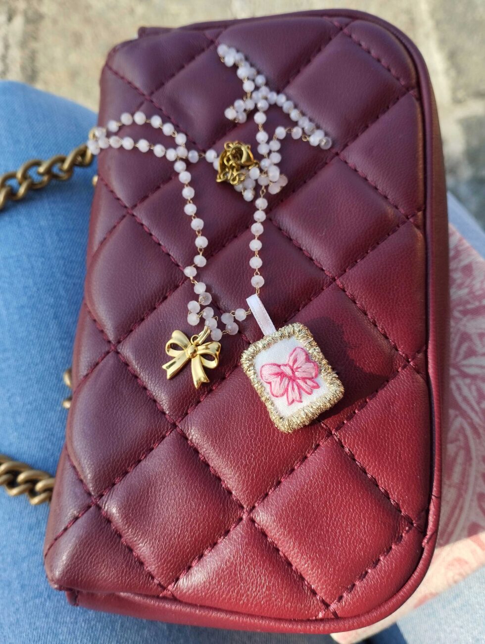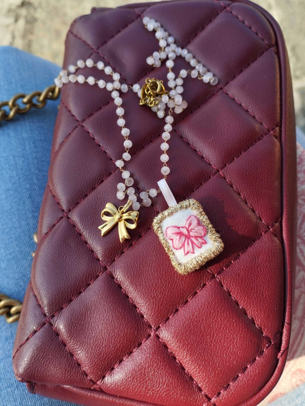 Medaglietta tessile centrale sagoma rettangolare ricamata a motivo fiocchetto rosa pastello con dettagli fucsia su base di cotone panna profilato lurex oro (misure circa 1,8 cm per 1,4 cm).