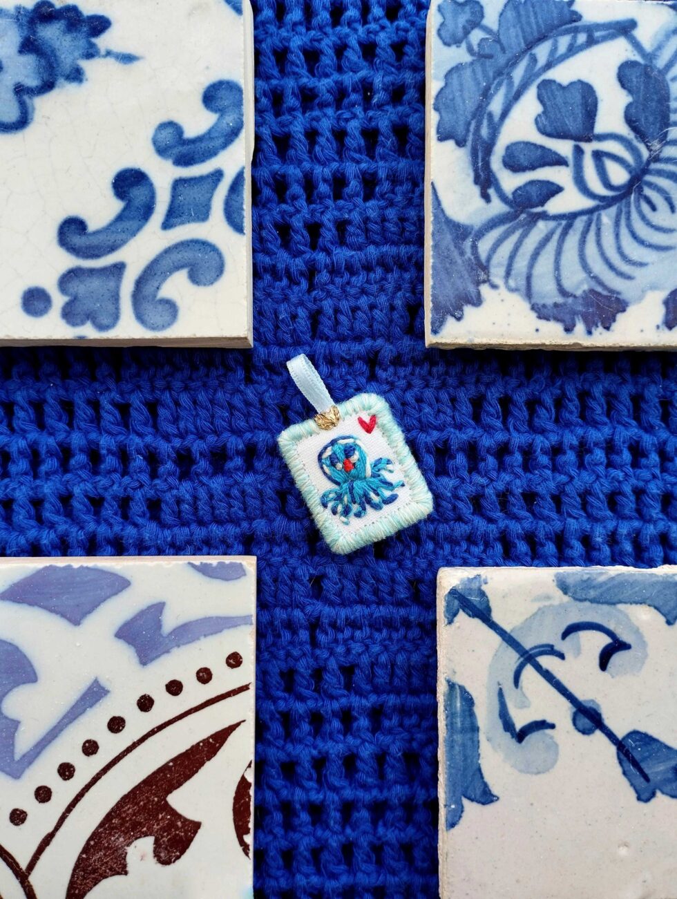 Foggia rettangolare con spiritoso ricamo di polpo turchese con dettagli blu vivace e cuoricino rosso.
