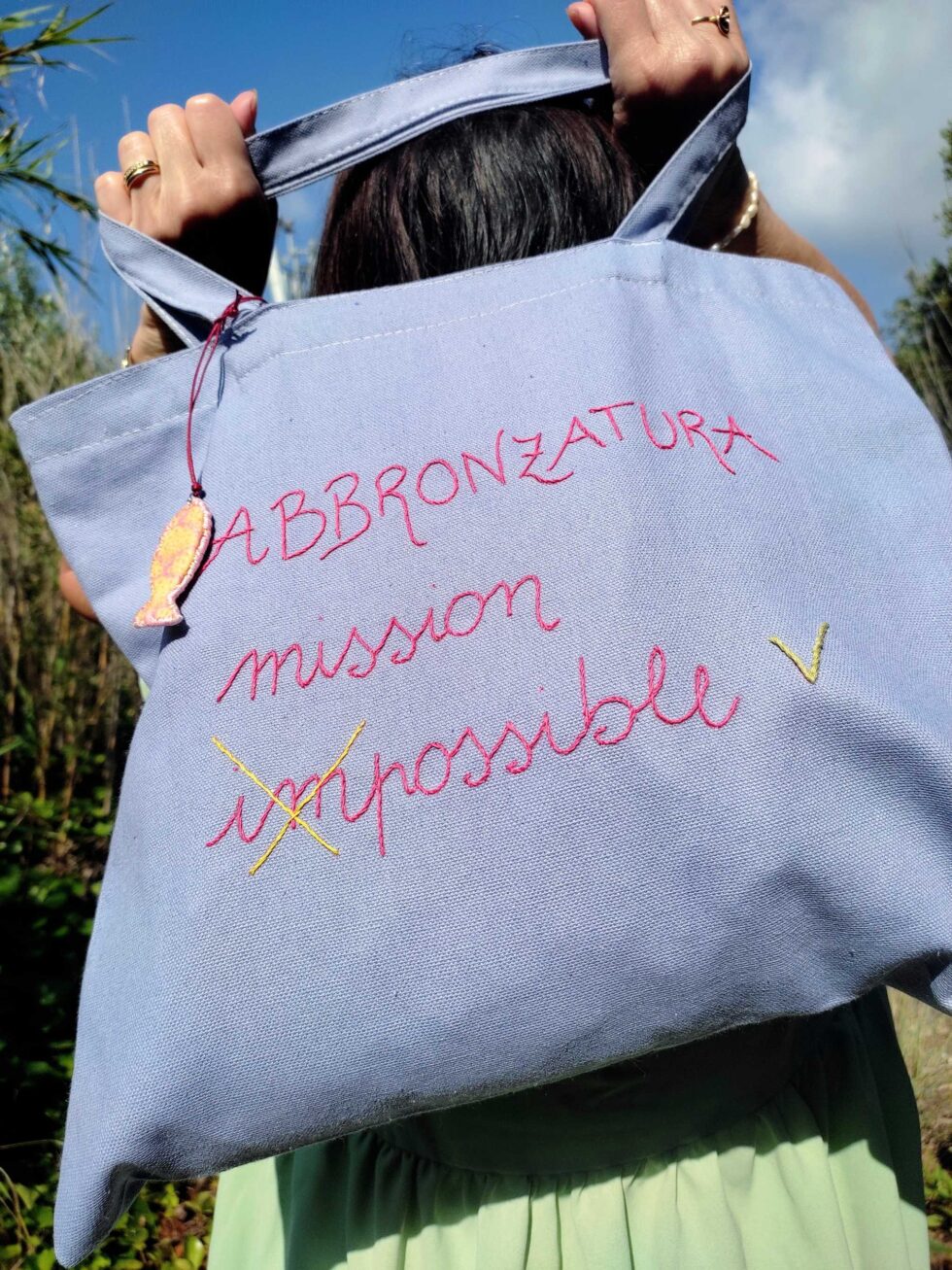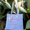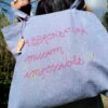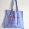 Borsa modello sacca di grande capacità in resistente tela color azzurro intenso ricamata con spiritosa scritta frontale in corsivo.