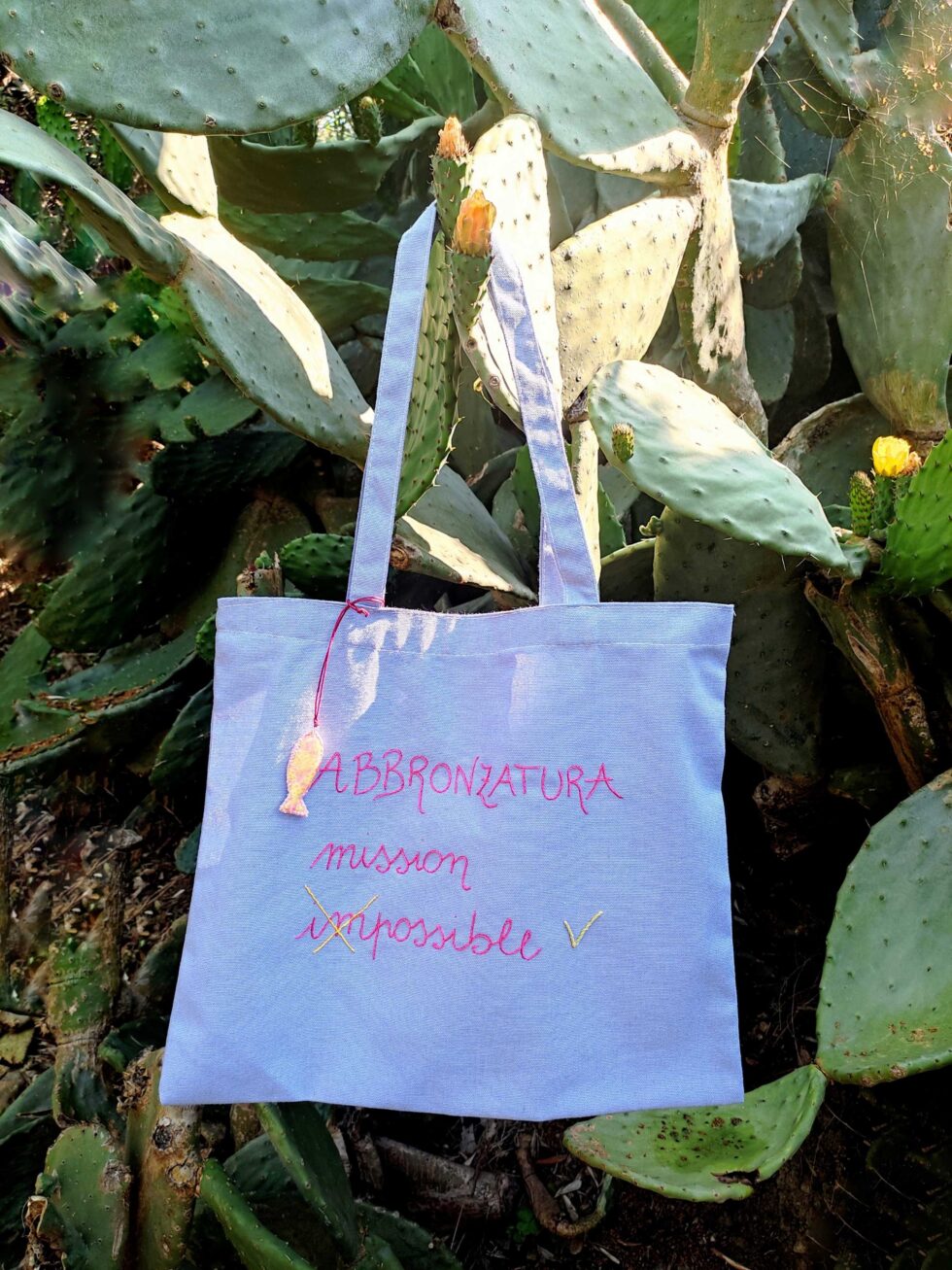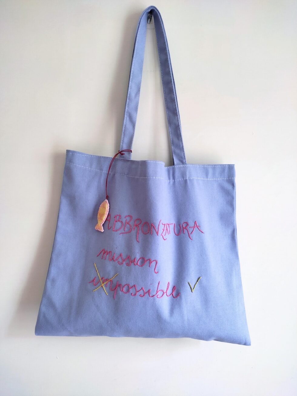 Impreziosita da dettaglio sbarazzino di portachiavi handmade staccabile al manico (sagoma pesciolino fantasia) che la rende ironica e spiritosa.