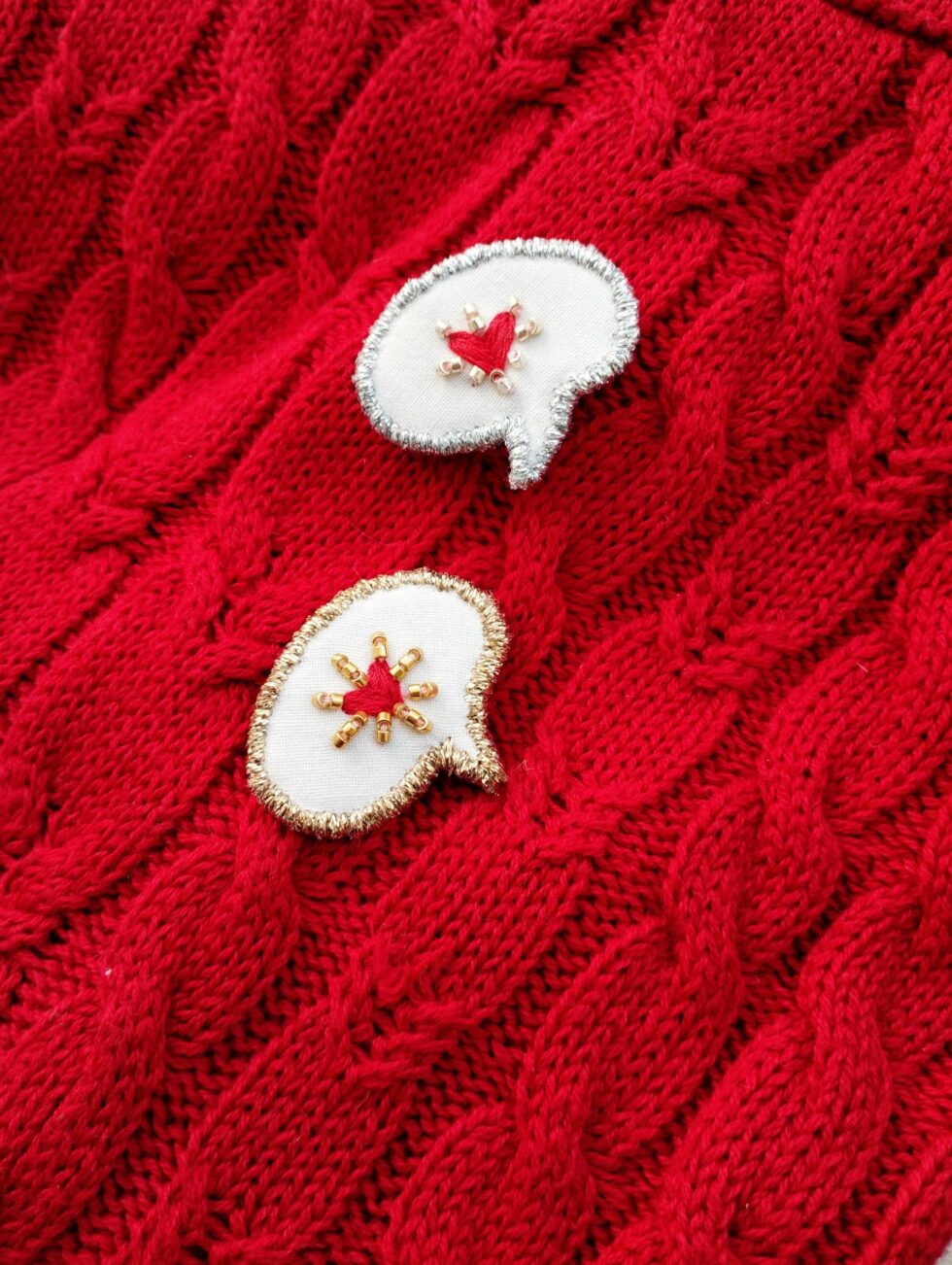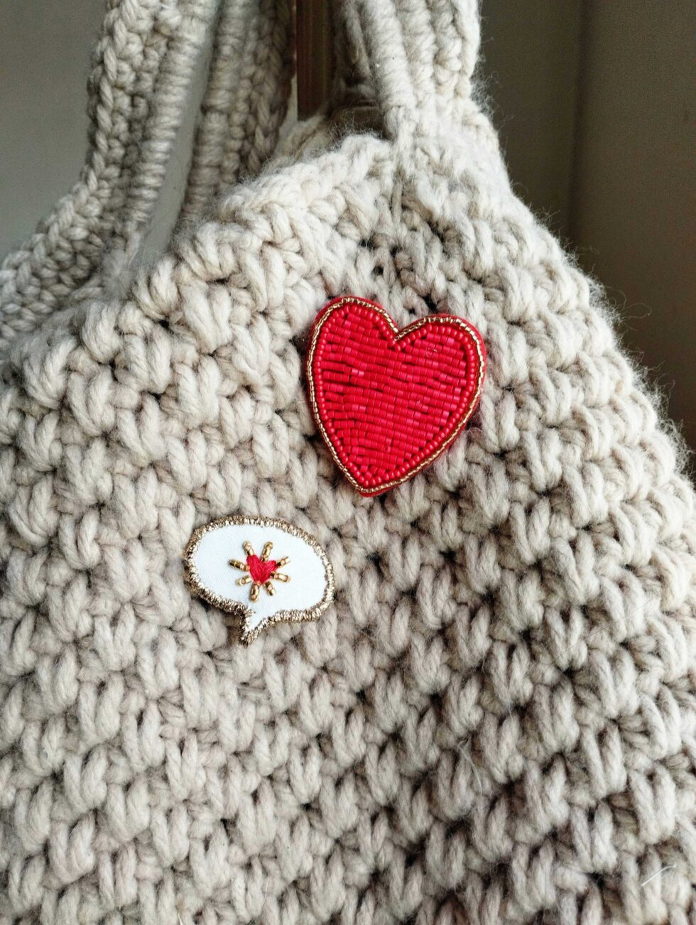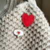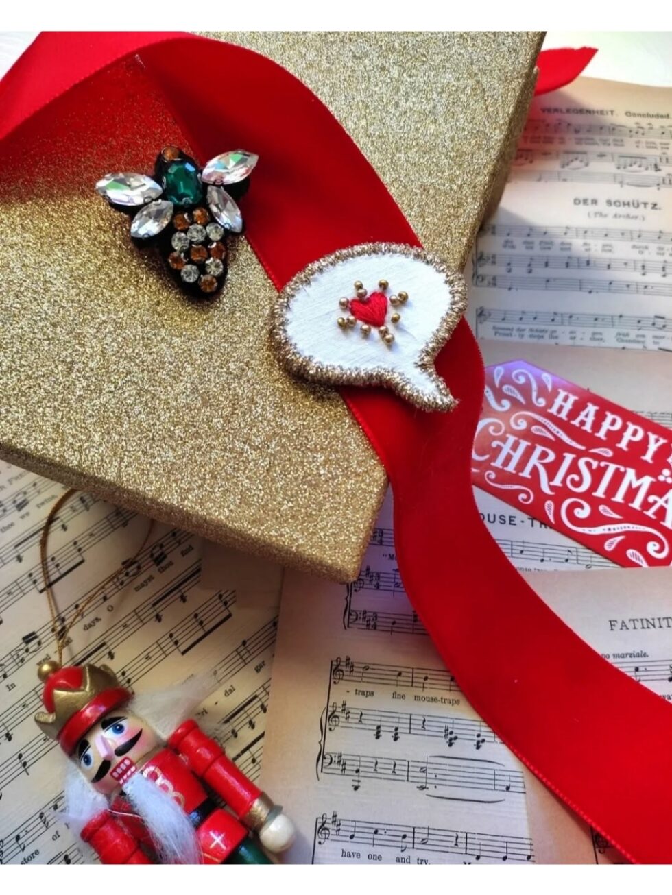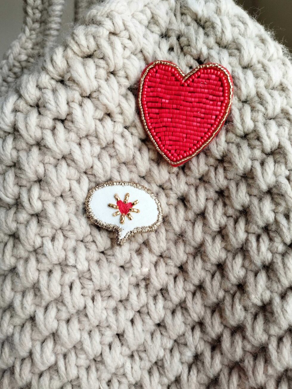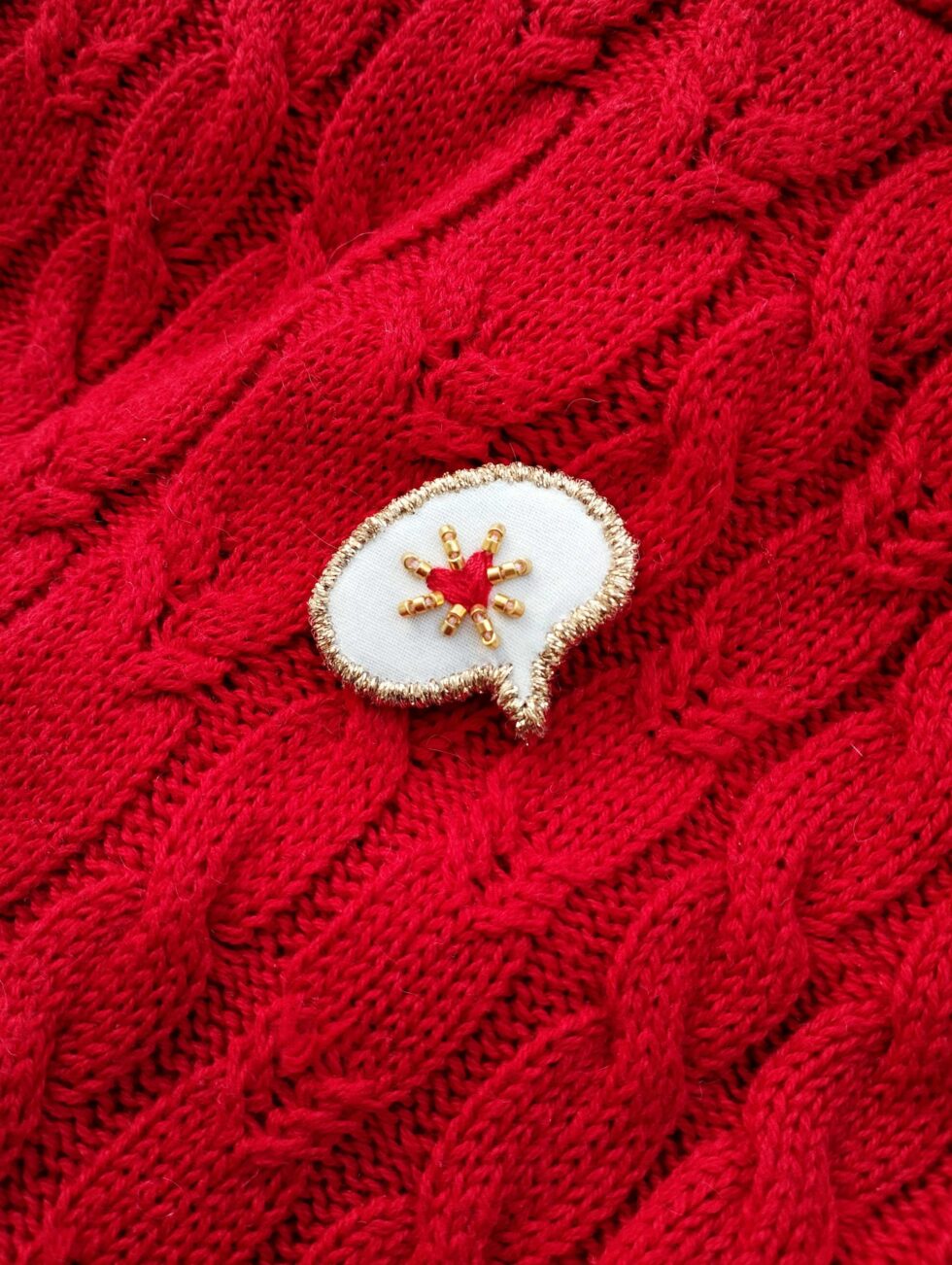 Spilla tessile con chiusura sul retro in metallo e frontale a foggia di vignetta fumettistica (misure: circa 3,8 cm di larghezza per 3 cm circa nel punto di massima altezza) in cotone bianco panna con ricamo cuoricino centrale con diramazione di perline di conteria dorata cucite a mano.
