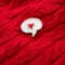 Spilla tessile con chiusura sul retro in metallo e frontale a foggia di vignetta fumettistica (misure: circa 3,8 cm di larghezza per 3 cm circa nel punto di massima altezza) in cotone bianco panna con ricamo cuoricino centrale con diramazione di perline di conteria dorata cucite a mano.