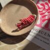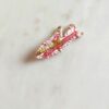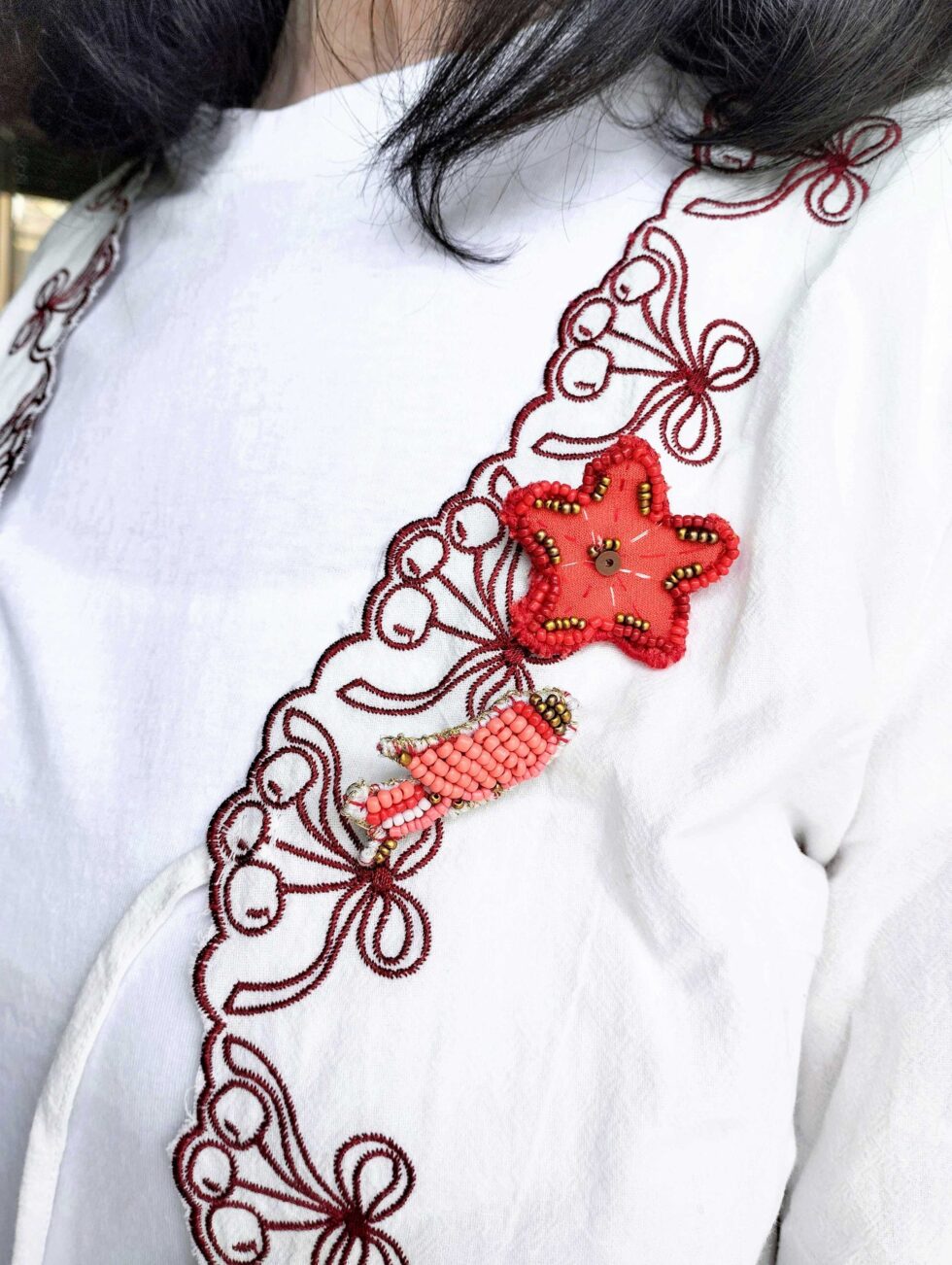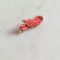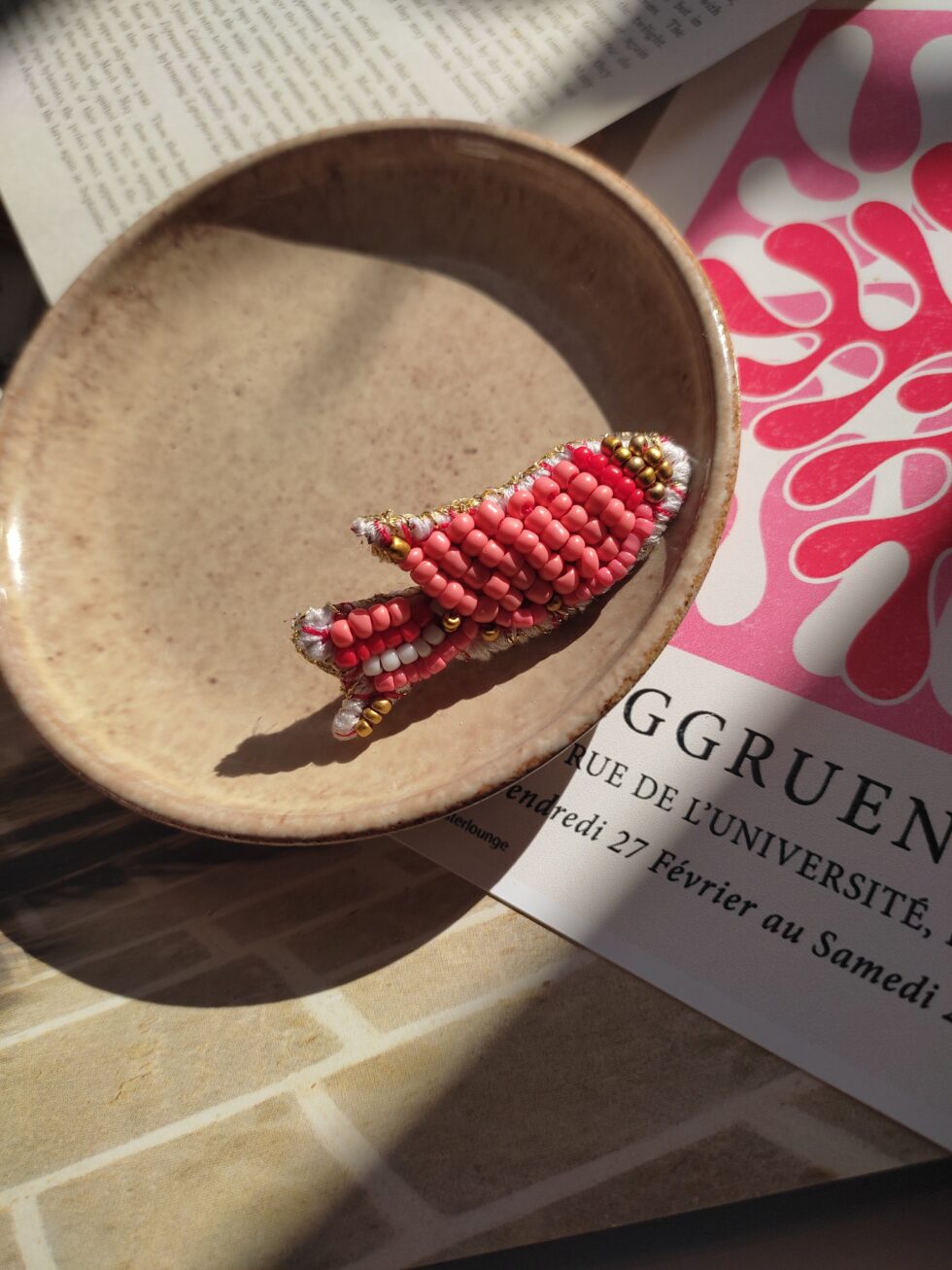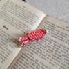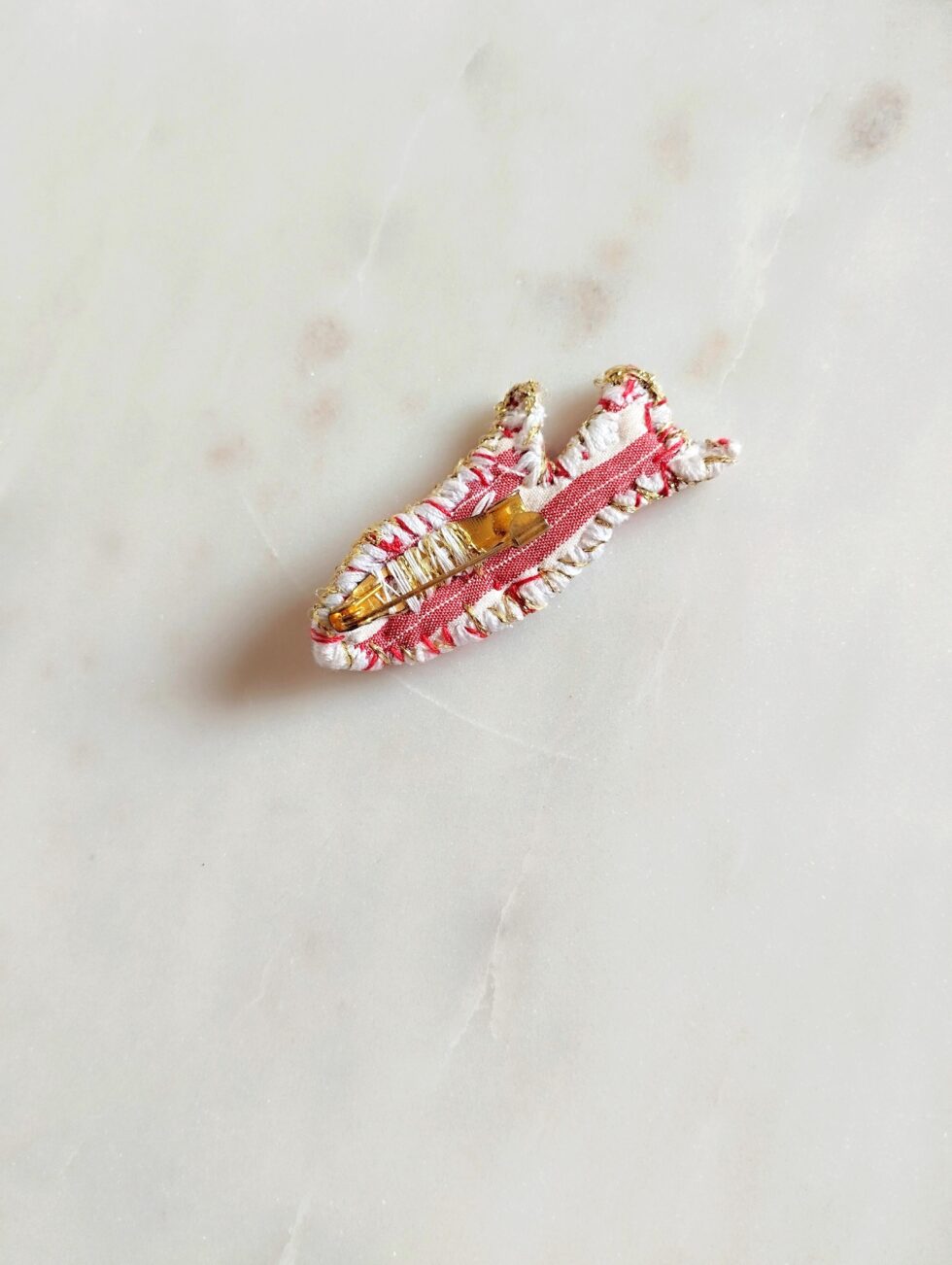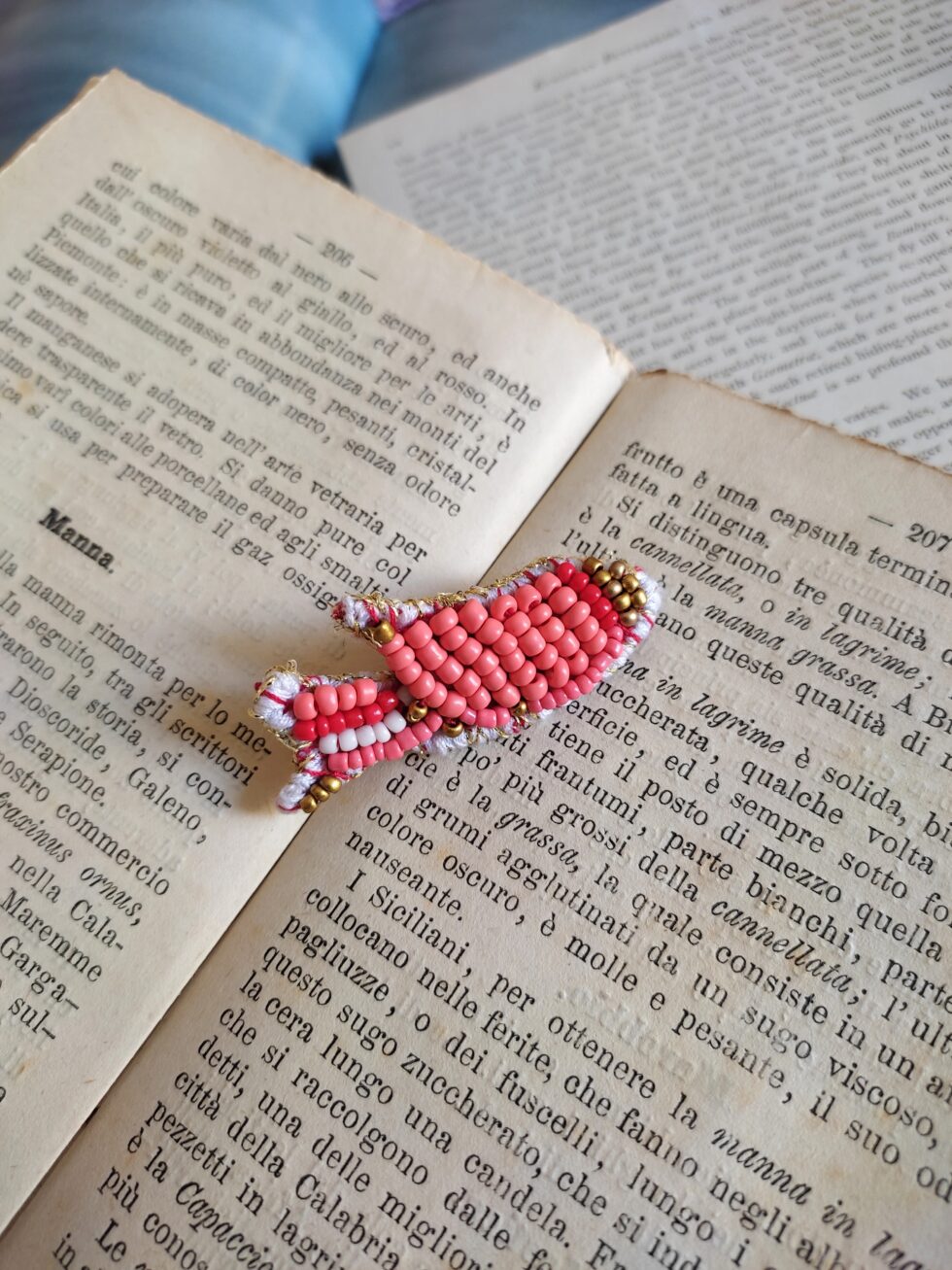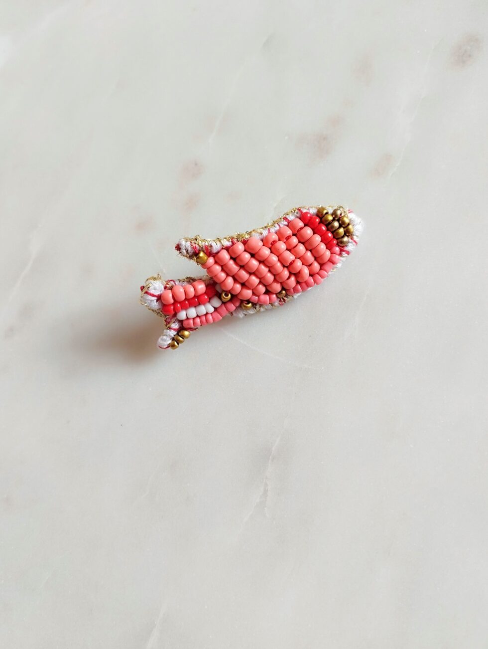 Spilla tessile con chiusura sul retro in metallo e sagoma di pesce allungato (misure: 1,5 cm di altezza per 4 cm circa di lunghezza) impreziosita da elementi di conteria e cristalli di varia dimensione nei toni del rosso primario e rosso corallo, interamente cuciti a mano.