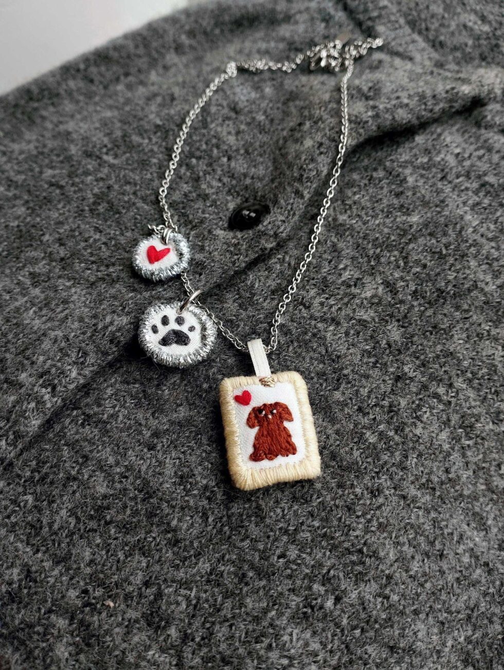 Foggia rettangolare con ricamo cagnolino marrone di piccola taglia a pelo lungo e arricciato e micro cuoricino rosso sullo sfondo.